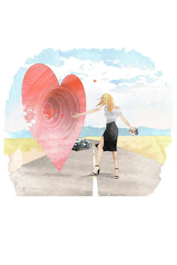 Experience the surreal with Love Vortex, a striking art print by Monica Lind. This dramatic piece shows a woman stranded on a highway with her car in the background, set against a sweeping desert and mountain landscape. A huge heart hovers beside her, releasing a spiral of small hearts as she reaches out, capturing the energy and emotion of love in motion.