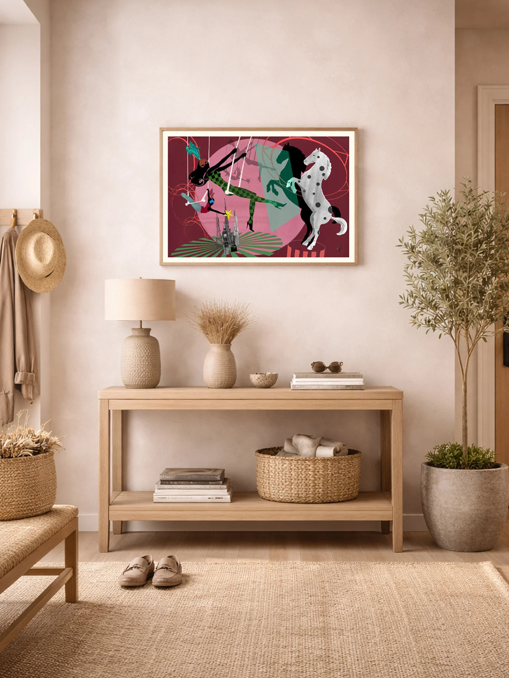 Bring bold storytelling and vintage circus charm into your home with this exclusive art print by Monica Lind. This captivating piece features surreal acrobats performing daring feats, a majestic rearing horse, and rich, theatrical colors that bring every scene to life. Designed for collectors, art enthusiasts, and lovers of unique home decor, this one-of-a-kind print transforms any room into a stage of imagination and wonder. Perfect for living rooms, offices, or creative spaces. It adds a dramatic, whimsical touch while showcasing your passion for modern, surrealist art. Available exclusively in Monica Lind’s official shop, this limited-edition print ensures that your walls are adorned with truly unique artwork that cannot be found elsewhere. Elevate your home with this extraordinary circus-inspired masterpiece and explore Monica Lind’s collection of imaginative, story-driven prints for more stunning additions to your art collection.
